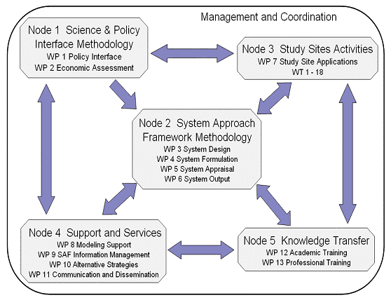 Node 1 produces reference material in the areas of social assessments, deliberation support tools, and methodology for economic evaluation that will serve the objectives of Systems Approach Framework (SAF) development and science-policy interfacing. Each of these activities is placed under the responsibility of a small group of partners that will then serve as a support group to teams in charge of SAF implementation in Study Site Applications (SSAs). Node 2 is in charge of SAF development. It is implemented by forming working groups to produce methodological frameworks. The work is divided into work packages and work tasks that represent a succession of steps. A small core group is responsible to prepare and deliver. The core group interacts with a larger group of researchers representing the study site teams in charge of SAF application. The SAF develops as an operational decision support system along with these interactions. Under Node 3, 18 Study Sites have been selected to develop an application of the SAF in an interactive manner with local stakeholders. For each SSA a collaborative team involving different core partners in association with affiliated partners is formed. Some involve international collaboration. Node 4 provides support and services to the whole SPICOSA community, in particular model support, internal and external information management, and an assessment of alternative strategies for Integrated Coastal Zone Management. Node 5 concerns knowledge transfer